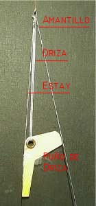 Observamos nuestro armado, lo comparamos con la foto (supongo que coinciden!) y vemos que con el primer aro fijador podremos correr la posición del puño de amura, y el segundo nos permite regular la tensión de la amura. (Interesante: en este caso, "amura" y "Cunninham de Foque" coinciden en un mismo pequeño aparejo!)